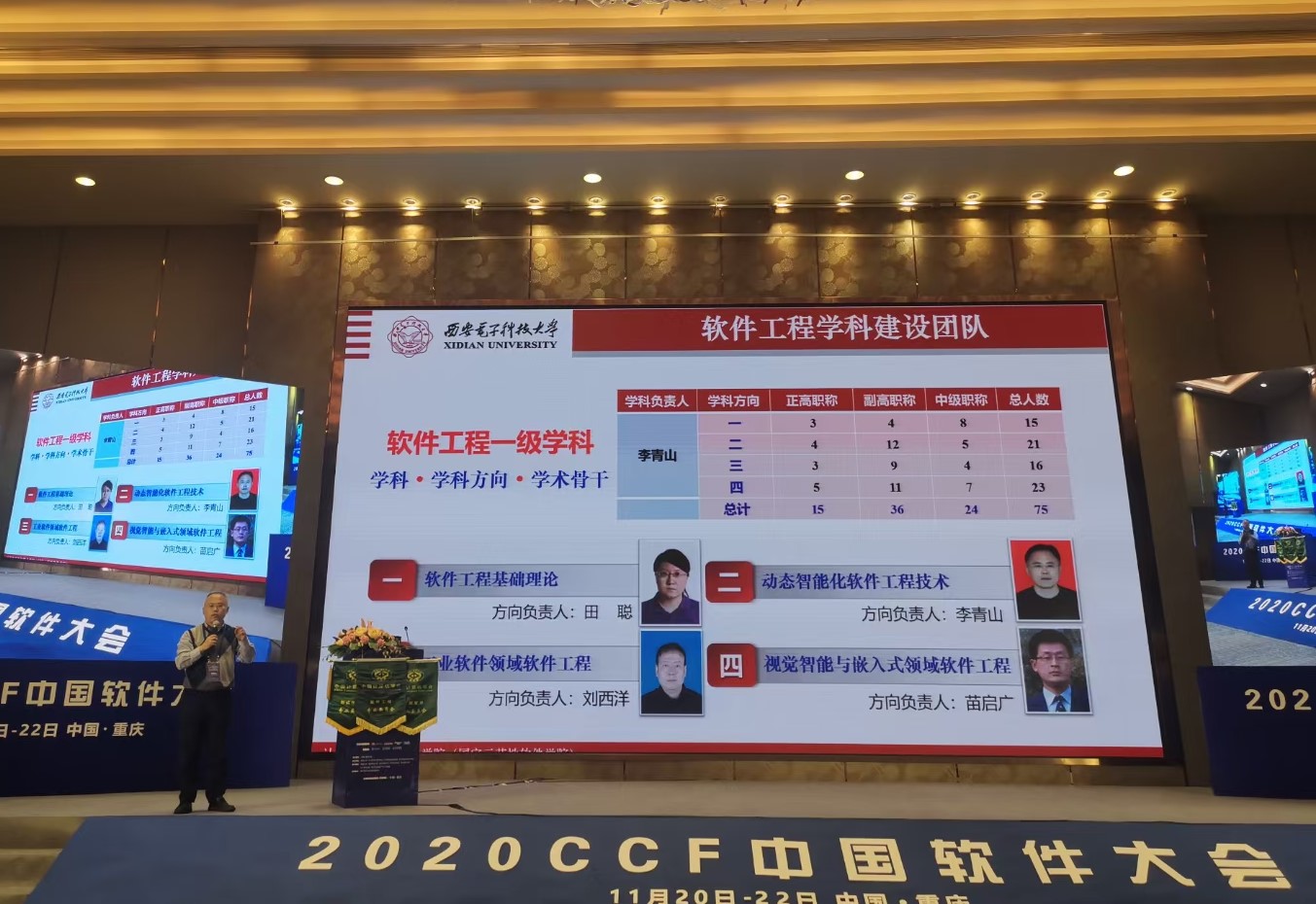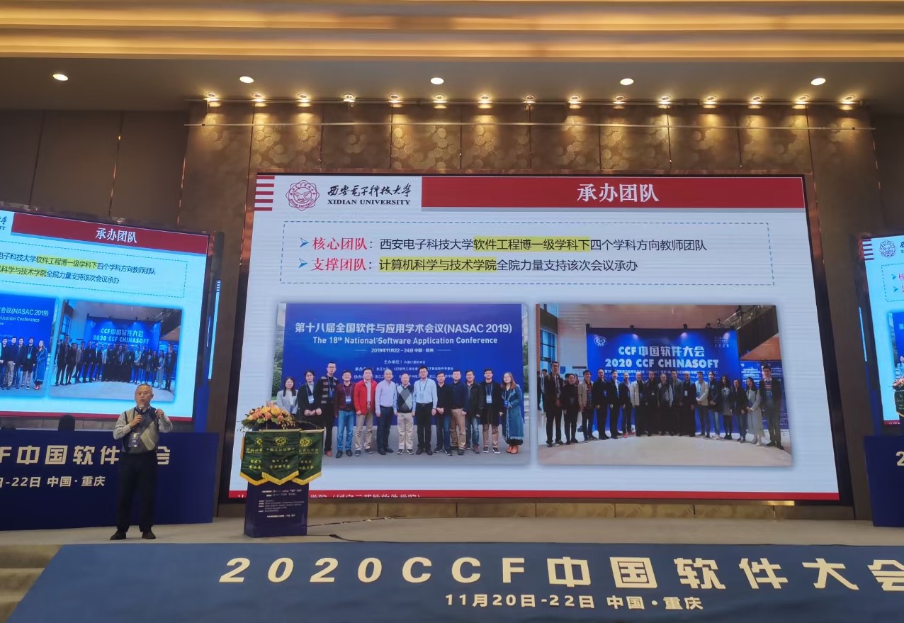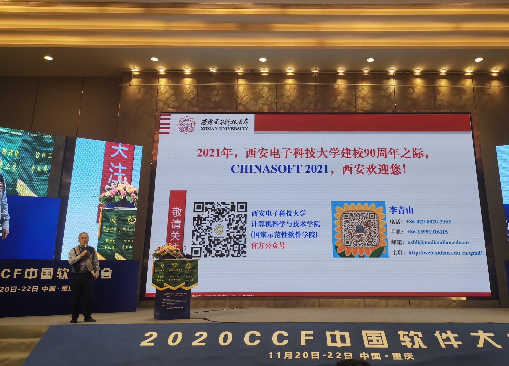 (通讯员 徐悦甡)2020年11月20日至11月22日,CCF中国软件大会(CHINASOFT)在重庆召开,会议由中国计算机学会(CCF)主办,CCF系统软件专业委员会、CCF软件工程专业委员会、CCF形式化方法专业委员会、重庆大学大数据与软件学院承办。beat365唯一官方网站软件工程学科四个学科方向的骨干教师20余人及部分学生,在学科负责人李青山教授、学科方向负责人田聪教授、刘西洋教授、苗启广教授以及学科秘书长宋胜利教授的带领下参加了会议。学科参会教师和学生有多篇论文被录用并被推荐到《软件学报》等知名期刊,参会教师和学生还在大会举办的教学与学科竞赛中获得佳绩。特别地,我校获批了明年CCF中国软件大会的承办权,李青山参加了下届会议的承办交接仪式。