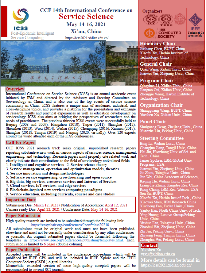 CCF第14届服务科学国际会议(CCF International Conference on Service Science,CCF ICSS)将于2021年5月14日至16日在陕西省西安市举行,会议由中国计算机学会服务计算专委会主办,beat365唯一官方网站承办。