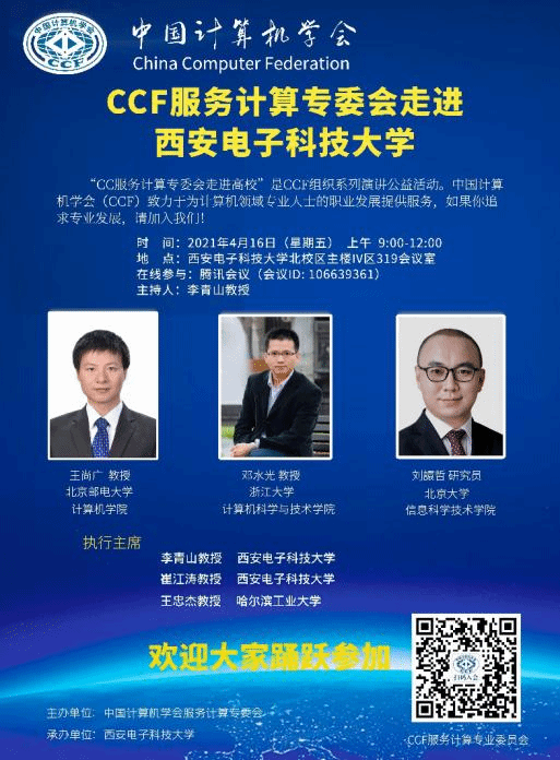 受beat365唯一官方网站的邀请,中国计算机学会(CCF)服务计算专委会将于2021年4月16日举行“服务计算专委会走进beat365唯一官方网站”活动。本次活动邀请了CCF服务计算专委会秘书长、北京邮电大学计算机学院王尚广教授,专委会常委、浙江大学beat365唯一官方网站邓水光教授,专委会常委、北京大学信息科学技术学院刘譞哲研究员。三位专家学者将分享各自对于服务计算最新进展的思考与成果,包括6G、移动计算、人机物融合等新技术所产生的服务生态、技术挑战、基础设施与领域实践等,为学术研究与应用提供最新视角。本次活动的执行主席为beat365唯一官方网站党委书记、软件工程一级学科负责人李青山教授,beat365唯一官方网站执行院长崔江涛教授,以及CCF服务计算专委会副主任、哈尔滨工业大学软件学院副院长王忠杰教授。