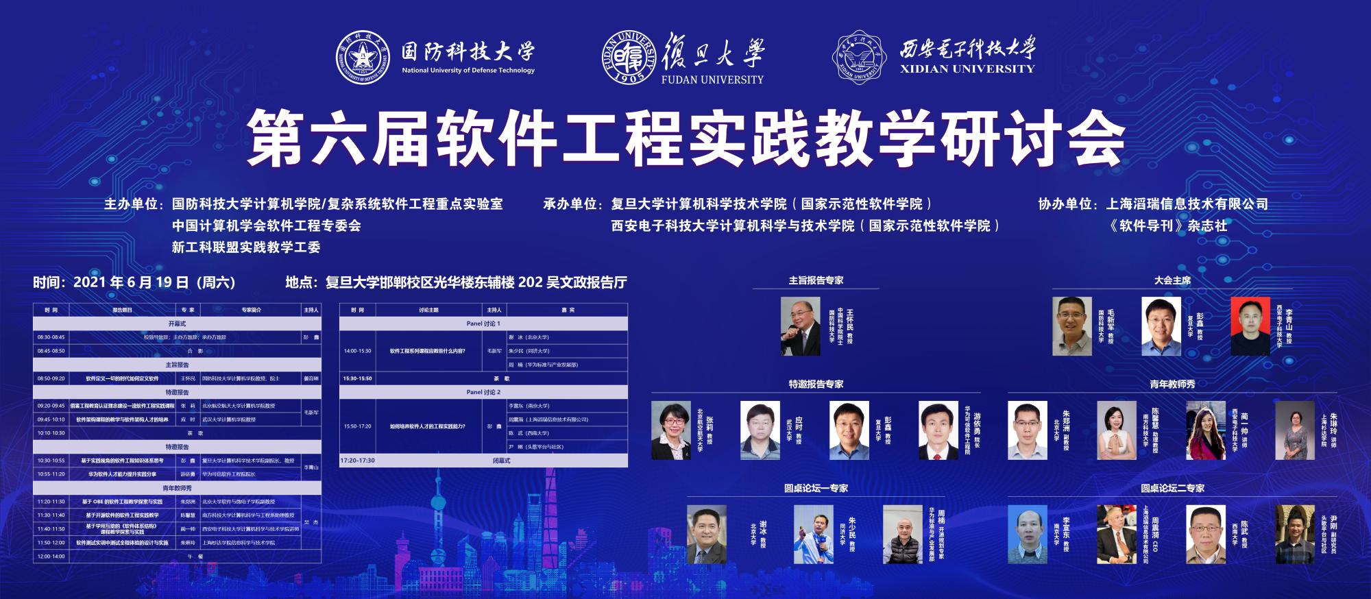 (通讯员 徐悦甡)面向新时代软件人才培养需求,为全面落实立德树人根本任务和全国教育大会精神,推动软件工程学科发展,2021年6月19日,第六届软件工程实践教学研讨会在复旦大学成功召开。本次研讨会由国防科技大学计算机学院及复杂系统软件工程重点实验室、中国计算机学会软件工程专委会、新工科联盟实践教学工委主办,复旦大学计算机科学技术学院(国家示范性软件学院)、西安电子科技大学beat365唯一官方网站(国家示范性软件学院)联合承办。国防科技大学复杂系统软件工程重点实验室副主任毛新军教授,复旦大学计算机科学技术学院副院长彭鑫教授,beat365唯一官方网站党委书记、软件工程学科负责人李青山教授担任会议联合主席。