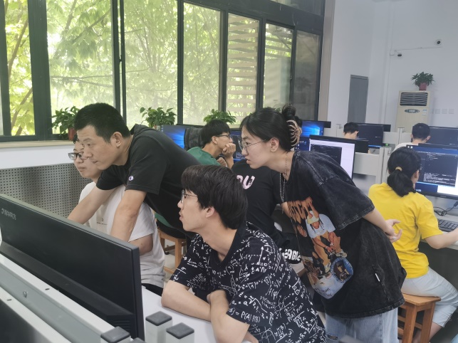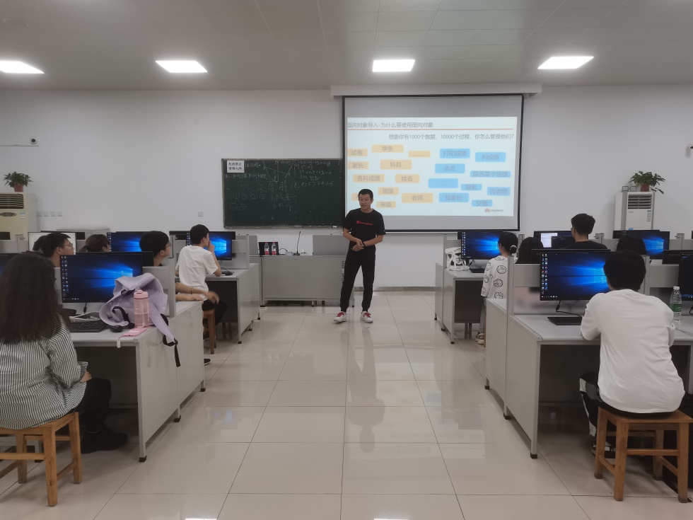 课程前半段,宋志朋老师主要进行理论讲授。从程序设计语言的发展历程引出为什么要使用面向对象,面向对象的特性以及基本语法等,讲述过程中积极与学生互动。后半段,宋志朋老师引导学生开始编程实操,鼓励学生们不懂就问。学生们也非常珍惜这样的学习机会,不仅积极提问,还主动上台演示自己的程序,即使在休息时间也舍不得离开机房,仍然继续练习实战。