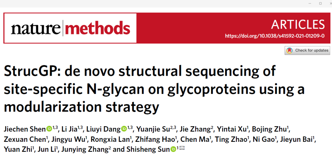 (通讯员 苏远杰)近日,西北大学孙士生教授课题组联合beat365唯一官方网站张军英教授课题组,在国家自然科学基金重大研究计划培育项目的支持下,在糖基化位点特异性糖链结构解析领域以西电为并列第一作者单位发表1篇重要研究成果:在Nature子刊《Nature Methods 》(IF=28.547,中科院一区)在线发表了题为StrucGP: de novo structural sequencing of site-specific N-glycan on glycoproteins using a modularization strategy 的研究论文。