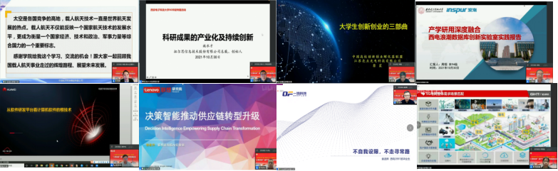 中国航天科技集团五院货运飞船系统副总设计师、本科88级院友党蓉作了《中国载人航天发展及展望》的专题报告,讲述了中国载人航天研制过程、货运飞船系统、载人航天发展展望以及航天梦想精神和文化。北京拓尔思信息技术股份有限公司创始人兼总裁、北京信息科技大学教授、本科82级院友施水才作了《科研成果产业化及持续创新》的专题报告,介绍了从高校研究中文信息检索起步,探索如何把科研成果实现应用的产业化,并在实现产业化过程中,如何实现持续创新和扩宽边界,并和高校形成新的合作创新关系。亮点光电科技有限公司董事长、中国高校创新创业孵化器联盟理事长、硕士00级院友蔡震作了《大学生创新创业的三部曲》的专题报告,分享了自身创新创业的经历和收获以及适合大学生创新创业的领域、科技热点、创业的五要素等。浪潮楼上平台和云溪数据库创始人、西电浪潮数据库创新实验室企业方主任、本科94级院友周恒作了《产学研用深度融合——西电浪潮数据库创新实验室实践》的专题报告,讲述了西电和浪潮集团面向国家和行业重大需求围绕分布式数据库、星载数据库等领域,在攻克国产数据库“卡脖子”问题、突破国产数据库核心关键技术方面的探索实践。华为云PaaS服务产品部研发部长、本科01级院友谈宗玮作了《从软件研发平台看计算机软件的根技术》的专题报告,介绍了以软件工程研发平台的视角来看待大型平台背后的核心知识结晶。联想集团研究院AI实验室智能大数据技术总监、硕士96级院友祁宏升作了《决策智能推动供应链转型升级》的专题报告,讲述了决策智能对于构建供应链智能的重要意义、必要条件和技术图景,为大数据和人工智能技术在促进供应链转型升级过程中发挥更大的作用进行有益的探讨。北京一流科技创始人 、本科99级院友袁进辉作了《不自我设限,不走寻常路》的专题报告,通过个人成长经历勉励院友秉持长期主义,勇敢追随内心,持之以恒探索自身极限,找寻到自己“注定”要做的事业。广州广哈通信股份有限公司研发总监、本科95级、硕士99级院友柯国富作了《基于5G的垂直行业融合应用架构》的专题报告,分享了以项目负责人身份参与并主导公司5G核心网的经历,介绍了广哈通信股份有限公司在5G时代的垂直行业融合应用相关产品和技术框架。