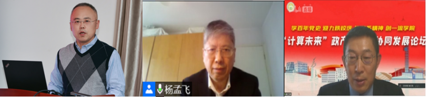 学院名誉院长、78级杰出院友杨孟飞院士致辞。杨院士首先对学校90年来取得的骄人成就表示祝贺,对学院建专业60余年在学科科研、人才培养等方面取得的进展表示肯定。他谈到,在母校90周年华诞之际,计科院举办“计算未来”政产学研用协同发展论坛恰逢其时,本次论坛探讨未来计算机的发展方向、思路和路径等具有重大意义。他勉励学院班子和师生面向国家重大需求,发挥计算机和软件学科优势,为推动学院发展、建设社会主义强国和实现中华民族伟大复兴做出更大的贡献。