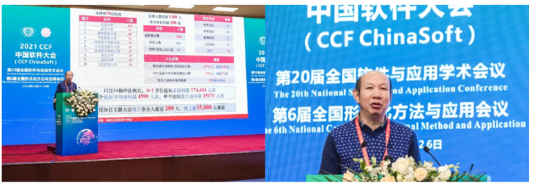 (通讯员 徐悦甡,李悦辰,崔笛)经过了12月24日与25日精彩纷呈的大会各论坛活动后,12月26日2021 CCF中国软件大会(CCFChinaSoft)在北京友谊宾馆线下开幕,并通过线上直播平台与B站全程直播。受原会议举办地陕西省西安市新冠疫情重大变故的影响,大会组委会对本届会议的举行方式进行了调整,3天的大会活动安排为,12月24-25日通过线上的方式进行各分论坛,12月26日在北京友谊宾馆设立线下会场,包括开/闭幕式、院士特邀报告、NASAC青年创新奖报告、第四届中国软件开源创新大赛颁奖等活动。9位中国科学院院士、中国工程院院士(林惠民、梅宏、吕建、廖湘科、杨孟飞、王怀民、冯登国、孙凝辉、钱德沛)与200余位代表线下参加了大会,其余代表与观众线上参会。26日在线直播平台全天在线人数超过7万人次。