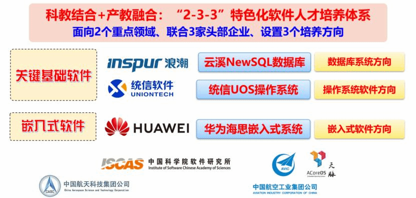 按照特色化示范性软件学院建设要求,学院聚焦国家软件行业重大需求,充分发挥西电在计算机与软件领域的办学特长和优势,根据关键基础软件、嵌入式软件等领域的人才培养特点,强化科教结合、产教融合,探索特色化专业建设规律,依托学院各类科研平台和青岛计算技术研究院等产教融合基地,联合华为、浪潮、统信等头部企业及中国科学院软件研究所、中国航天科技集团五院502所、中国航空工业集团公司西安航空计算技术研究所等科研院所在操作系统(统信UOS、华为鸿蒙、华为欧拉、中科院FactOS、星载操作系统SpaceOS等)、数据库(浪潮云溪NewSQL、华为GaussDB、阿里PolarDB等)和嵌入式软件(国产输入输出设备、华为海思嵌入式处理器等)等领域合作开展大量自主可控核心技术攻关和人才培养,在关键基础软件和嵌入式软件领域形成了坚实的核心技术攻关能力,开展特色化教材体系、师资队伍和专业实践教学基地建设,形成具有西电特色的高层次软件人才培养模式,高质量推进特色化示范性软件学院建设工作。
