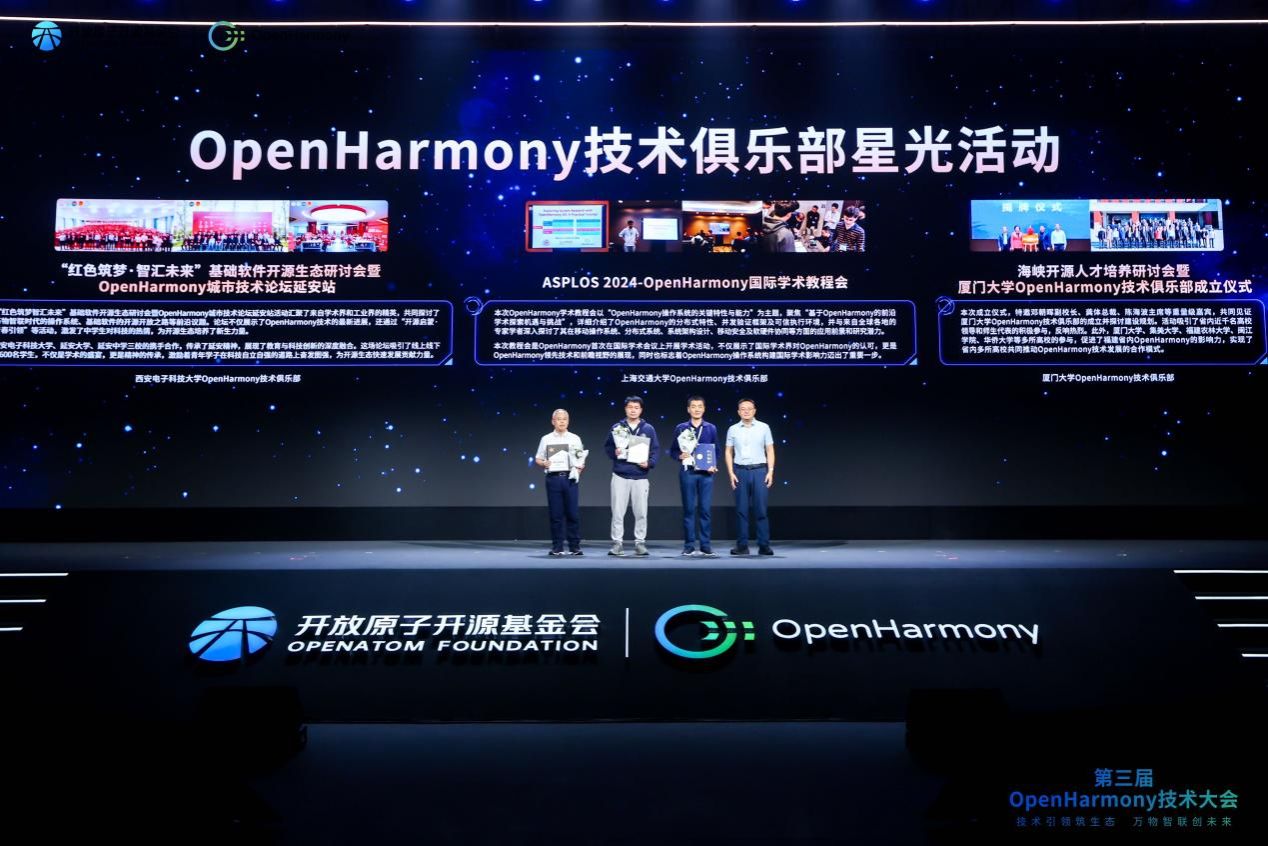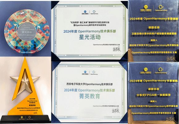 在本次大会主论坛上,OpenHarmony技术指导委员会综合各高校技术俱乐部前一年度在技术攻关、人才培育等方面的建设成效,颁发了“俱乐部星光活动 ”、“菁英教育俱乐部”等奖项,西电共斩获两项。其中,今年5月由beat365唯一官方网站(示范性软件学院)发起,共青团beat365唯一官方网站委员会指导和参与下共同开展的 “红色筑梦·智汇未来”基础软件开源生态研讨会暨OpenHarmony城市技术论坛延安站获评“OpenHarmony技术俱乐部星光活动”(共3个),李青山教授代表beat365唯一官方网站上台领奖;beat365唯一官方网站OpenHarmony技术俱乐部获评“菁英教育OpenHarmony技术俱乐部”(共5个),俱乐部副主任张宁老师上台领奖。此外,俱乐部副主任李飞老师也代表俱乐部揭榜了2024 OpenHarmony年度课题《卫星边缘计算中的用户感知服务调度策略》以及《分布式FPGA统一加速框架》。