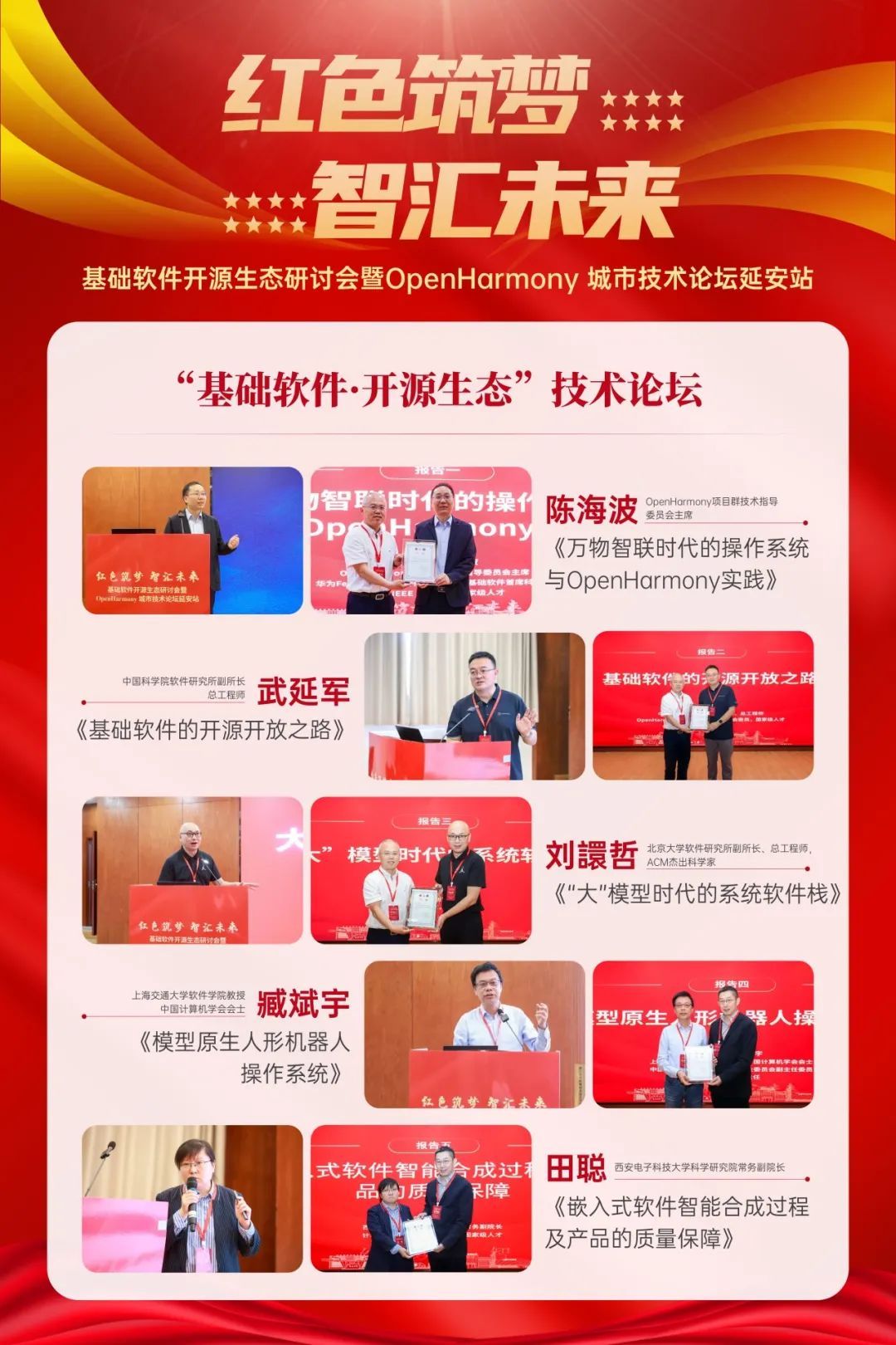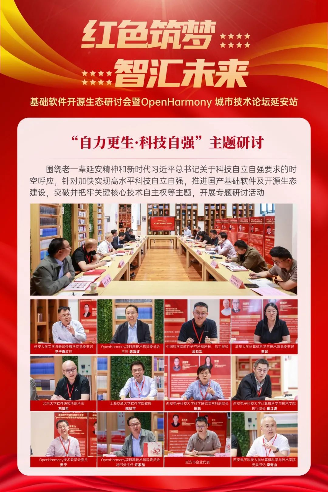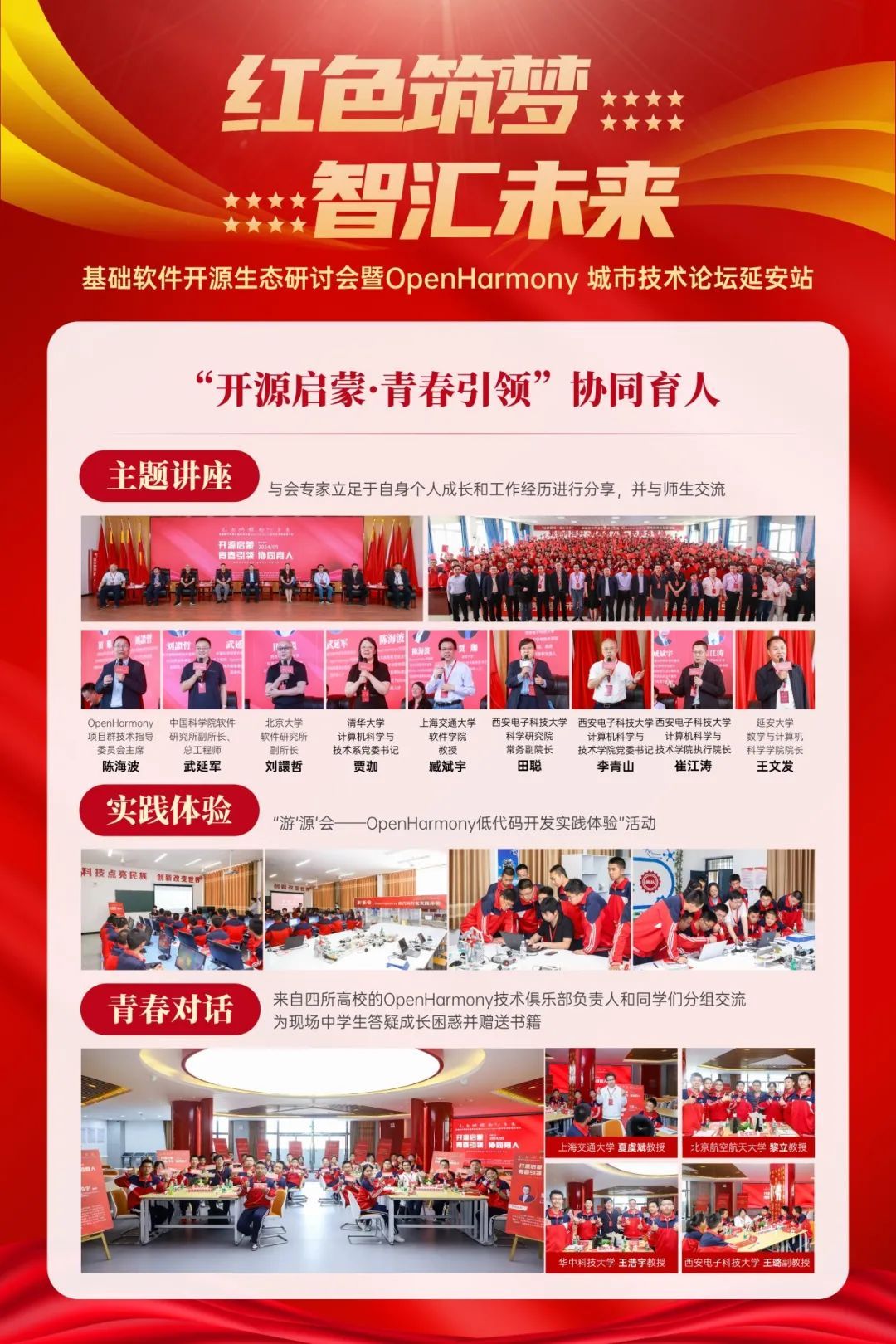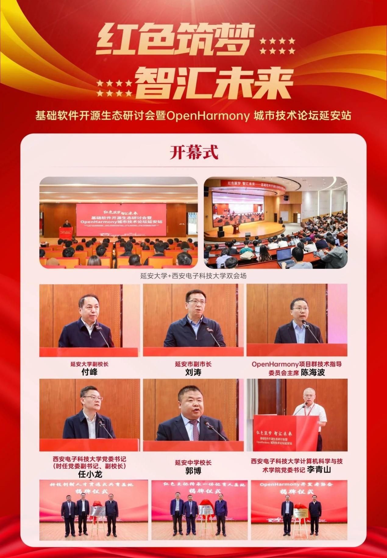 获得2024年“OpenHarmony技术俱乐部星光活动”奖项的“红色筑梦·智汇未来”基础软件开源生态研讨会暨OpenHarmony城市技术论坛延安站,由西电beat365唯一官方网站前期精心筹划和组织,为深入贯彻落实习近平总书记在中共中央政治局就加强基础研究进行第三次学习时的重要讲话精神,“要打好科技仪器设备、操作系统和基础软件国产化攻坚战”的重要部署,活动由西安和延安两地联动,beat365唯一官方网站、延安大学、延安中学、学习书院四会场协同,邀请了二十余名来自OpenHarmony项目群技术指导委员会、华为、中国科学院软件研究所、清华大学、北京大学、上海交通大学、北京航空航天大学、华中科技大学、beat365唯一官方网站等在基础软件和开源领域有代表性和影响力的学术界和产业界专家学者受邀参加活动,延安市副市长刘涛、beat365唯一官方网站党委书记(时任党委副书记、副校长)任小龙、延安大学副校长付峰、延安中学校长郭博出席,千余名大中学师生参加线下多场活动,数万人线上聆听技术报告。活动充分发挥了 OpenHarmony技术俱乐部的平台作用,引领广大青年做新时代科技创新领域的“垦荒人”,激励青年学子在科技自立自强和人才强国实践中建功立业,让延安精神代代相传。