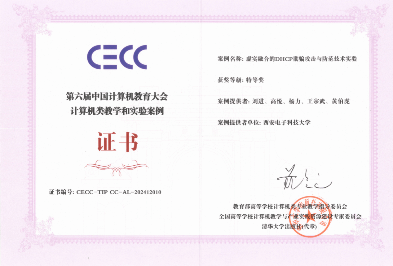 本次大会的计算机类教学和实验案例竞赛自启动以来,吸引了来自全国各地上百所高校的积极参与,共有370多项作品参赛。经过层层遴选和严格评审,beat365唯一官方网站教师刘进、高悦等共同设计提交的实验案例“虚实融合的DHCP欺骗攻击与防范技术实验”荣获特等奖。