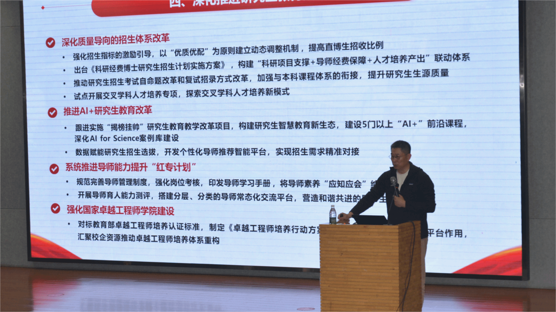 学院执行院长崔江涛结合学院实际重点回顾了学校十三项重点任务上半年进展情况,解读了学校关键核心指标完成情况,说明了新形势新要求下学校统筹推进的八项综合改革和八项战略行动,传达了学校下半年工作部署,以学校“1236阶段性发展目标”为切入点分析了学院发展目标和思路。他强调,2025年是“十四五”规划收官之年,也是“十五五”规划的谋篇布局之年,要强化顶层规划与战略引领,学院将紧扣学校年度重点任务,围绕“国家急需、社会关切”的领域推动有组织科研“落地见效”,重点推进师资队伍建设,加快高水平科研平台布局,推动学院各项事业高质量发展,为学校发展贡献“计科力量”。