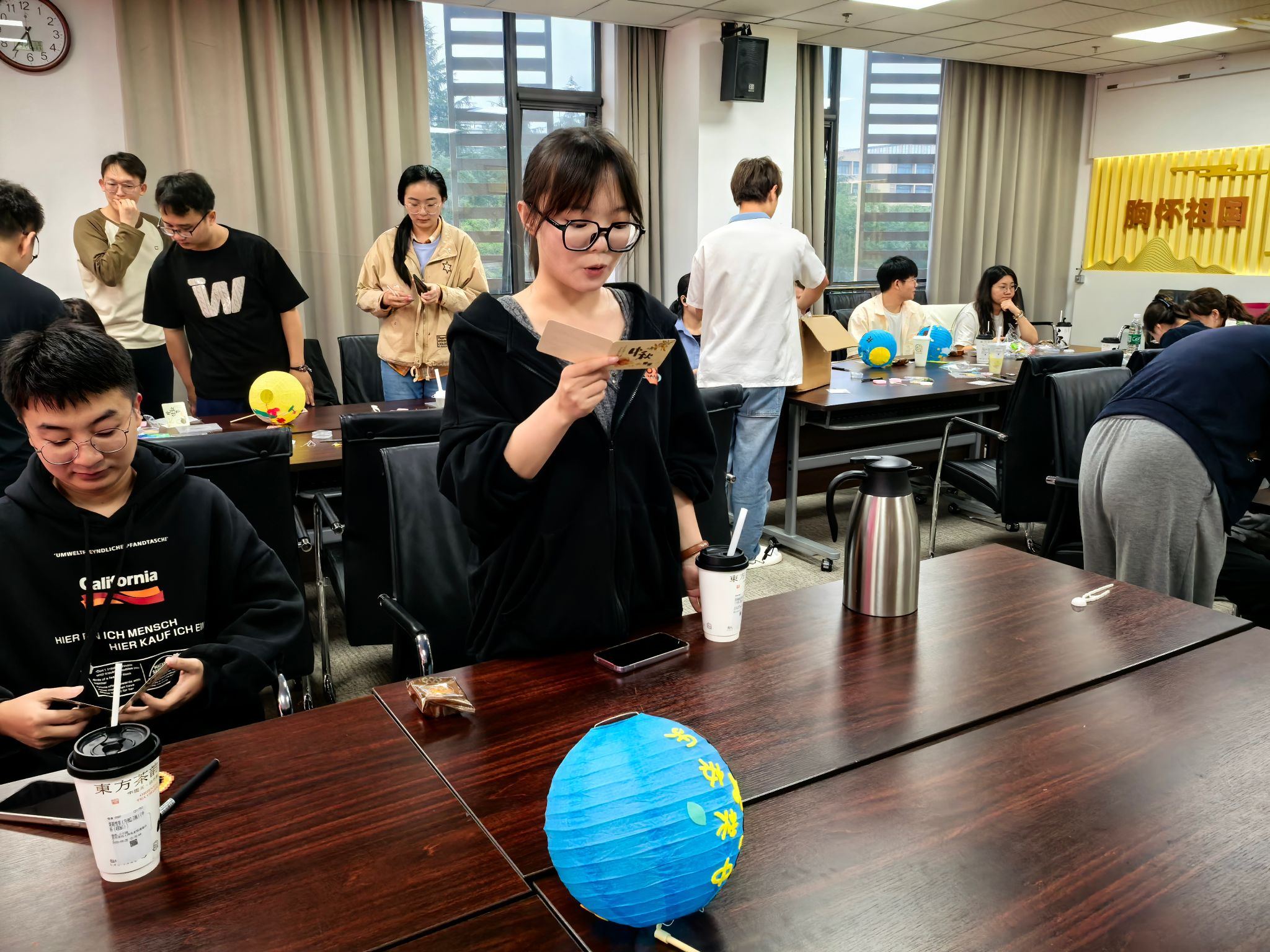 随着各体验环节渐入尾声,活动进入了“家乡中秋故事会”环节。同学们围坐在一起,分享各自家乡的中秋习俗与温情故事,不同地域的文化在这里碰撞出精彩火花,也让同学们在交流中更深刻地理解中秋“团圆”的文化内涵。随后,同学们依次从盲盒中抽取祝福卡片,当读到卡片上真挚的文字时,现场不时响起阵阵笑声与掌声。“愿你科研顺利,中秋快乐”“希望这个中秋,我们都能收获满满温暖”,简单的话语传递着同窗情谊。