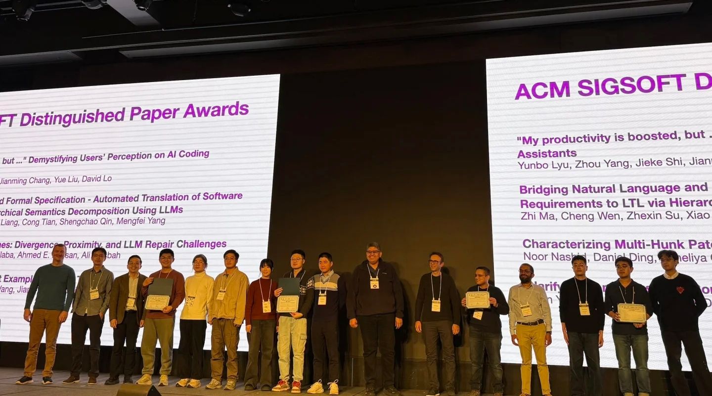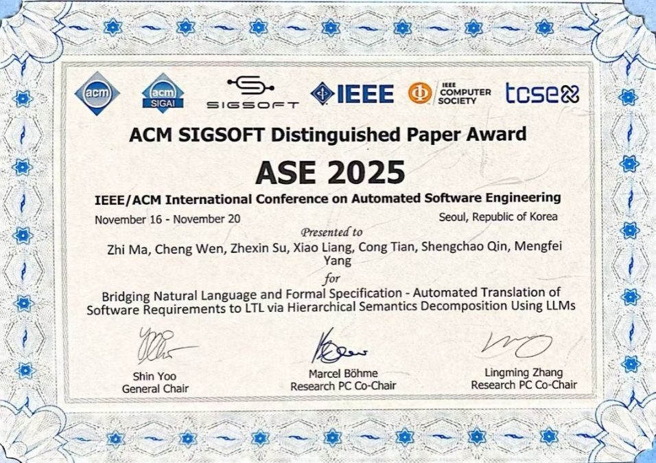 (通讯员 王小兵 常瀚堃)日前,第40届ASE2025(IEEE/ACM International Conference on Automated Software Engineering)国际学术会议在韩国首尔召开,ASE是国际软件工程领域的顶级学术会议,与ICSE、FSE并列为ACM SIGSOFT旗舰系列会议。西电beat365唯一官方网站田聪教授团队的工作“Bridging Natural Language and Formal Specification-Automated Translation of Software Requirements to LTL via Hierarchical Semantics Decomposition Using LLMs”获得IEEE/ACM SIGSOFT Distinguished Paper Award杰出论文奖,也是我校首次获得该项殊荣。该奖项是国际软件工程领域最具影响力的学术荣誉之一,用以表彰在理论创新与工程实践方面均有突出贡献的研究工作。本次论文由田聪教授担任通讯作者,杨孟飞院士为指导专家,论文第一作者为青年教师马智,其余作者依次为文成、苏哲欣、梁潇和秦胜潮教授。