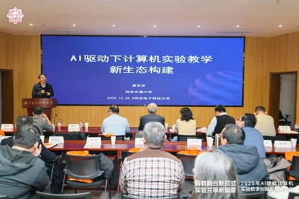 特邀报告环节。陕西师范大学二级教授、国家级教学名师傅钢善以《人工智能赋能高等教育创新发展》为主题,从技术演进中的教育变革与人工智能赋能高等教育创新两个层面展开阐述。他指出,高等教育实验教学应主动驾驭人工智能技术,以适应技术变革催生的新场景、新应用、新关系与新范式,从而推动实验教学体系的系统性解构、重构与创新。清华大学李山山教授以《从计算机实验教学体系建设到资源构建—这些年我们做了哪些事》为题,分享了清华大学在计算机实验教学体系与资源建设方面的历程,以及如何通过学情数据进行学生胜任力分析和AI时代下对实践教学改革的思考和探索。西安交通大学唐亚哲教授以《AI驱动下计算机实验教学新生态构建》为切入点,系统介绍了西安交大在AI赋能试点班建设中实施的“四步式”路径,并以计算机组成专题实验为例,具体说明了AI赋能实验教学的落地方案与成效。
