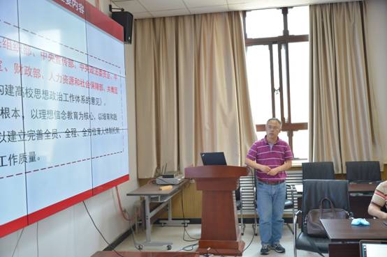 李青山领学教育部等八部门印发的《关于加快构建高校思想政治工作体系的意见》,带领与会成员集体学习了理论武装体系、学科教学体系、日常教育体系、管理服务体系、安全稳定体系、队伍建设体系和评估督导体系等七大体系的具体内容。李青山结合学院三全育人综合改革试点、联合支部党建育人作用发挥、课程思政建设等实际谈到,全院教师一是要统一认识,深入领会文件精神,把握《意见》精神实质;二是要积极谋划,认真落实。在支部活动、专业课程等方面强化对学生的政治引领和价值引导,不断加强党建带团建、学院文化培育、辅导员队伍建设的力度,将各项要求落到实处。李青山还针对“教育部思政司负责人就《意见》答记者问”进行了逐条说明。