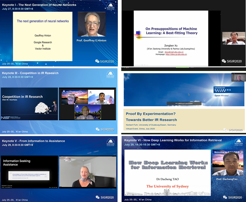 大会邀请到了多位信息检索和机器学习领域的嘉宾发表主题演讲,包括加拿大多伦多大学荣誉教授、图灵奖得主Geoffrey Hinton;西安交通大学教授、中国科学院院士徐宗本;美国国家标准技术研究院(NIST)的资深科学家、ACM Fellow Ellen Voorhees;德国杜伊斯堡埃森大学教授、信息检索终身成就奖Salton Award获得者Norbert Fuhr;Google用户体验部门总监、ACM Fellow、ACM副主席Elizabeth Churchill;悉尼大学教授、澳大利亚科学院院士、欧洲科学院院士陶大程等。