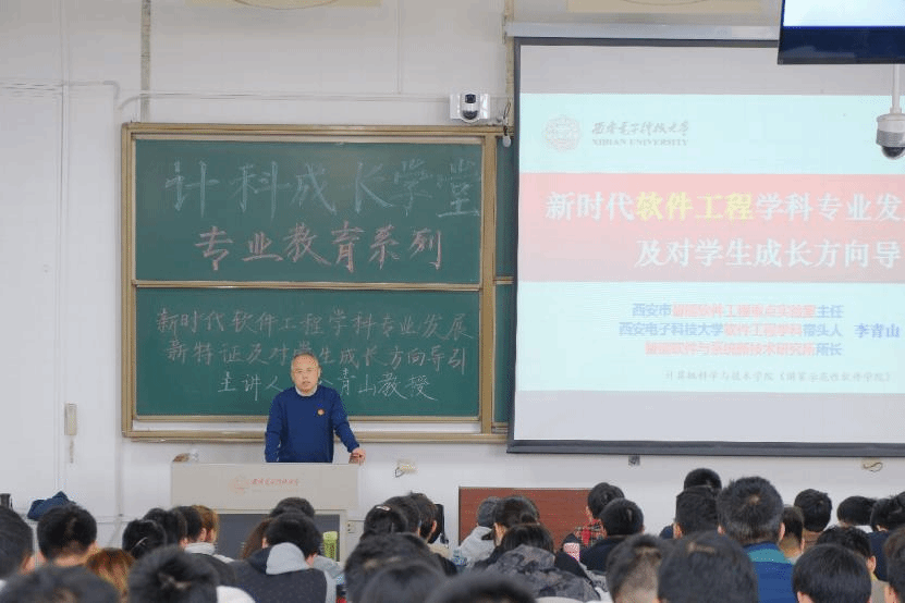 李教授对学院软件工程学子的成长成才提出了建议,提出了“同频共振历史潮流时代发展,主动融入国家主流社会主律”的殷殷期许。他指出,作为西电学子,同学们首先要认清时代潮流,洞悉时代主旋律,认清行业和技术发展的趋势,紧跟时代发展大势;其次是要理清我国发展时空方位,把握个人特色优势,在时代洪流中保持头脑清醒;第三要同频国家需求,紧跟国家、产业、行业的需求,练就过硬本领,将个人发展融入到国家发展的大潮中;第四要共振社会主律,将个人价值与幸福与中国梦融为一体,做德智体美劳全面发展、堪当大任的时代青年。在报告的最后,李教授勉励各位计科学子珍惜时光,珍惜时代和国家给予的机会,掌握知识、增强本领,提升自我,将个人发展与时代、民族、国家的发展同频共振,实现自我价值与社会价值的有机统一。