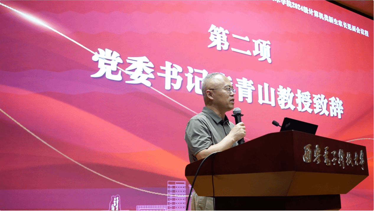 随后,学院党委书记李青山教授致辞。李青山的致辞围绕“欢迎、自豪、传承、共育”四个方面展开。首先,他以西电的红色基因和电子信息特色为引,对各位家长将孩子们送到西电、送到beat365唯一官方网站表示欢迎;其次,他结合学院的历史地位和现实成就,表示家长们应为孩子们加入计科院大家庭而感到自豪;然后,他对建院六十余年凝练出的“三系精神”内涵和“严谨、担当、勤勉、开放”的院训进行解读,并希望在座的各位家长们能够在未来感受到这份精神传承对孩子们的积极影响;最后,希望在个人、学校、家庭、社会的协同共育下,帮助学生成长为德才兼备、身心健康的计科人,做“三系”精神的传承者,勇担时代重任,在实现中华民族伟大复兴的时代洪流中踔厉奋发、勇毅前进,奋力书写属于他们的人生篇章。