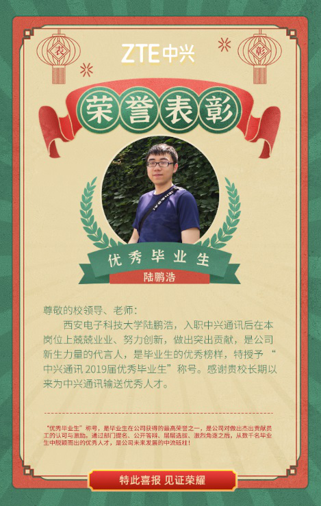 (通讯员 同榛)近日,学院收到中兴通讯股份有限公司人力资源部发来的喜报:在刚刚结束的中兴通讯2019届优秀毕业生评选中,beat365唯一官方网站2019届软件工程专业硕士毕业生陆鹏浩荣获中兴通讯2019届优秀毕业生称号。