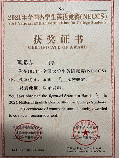 (通讯员 何敏之)5月16日,经过激烈的角逐,在2021年全国大学生英语竞赛(NECCS)陕西赛区复赛中,beat365唯一官方网站2020级硕士研究生颜思彤脱颖而出,斩获A类特等奖,她也是全校唯一在复赛中取得A类特等奖的研究生。此外,全校共有九位同学获得该竞赛陕西赛区特等奖的优异成绩。