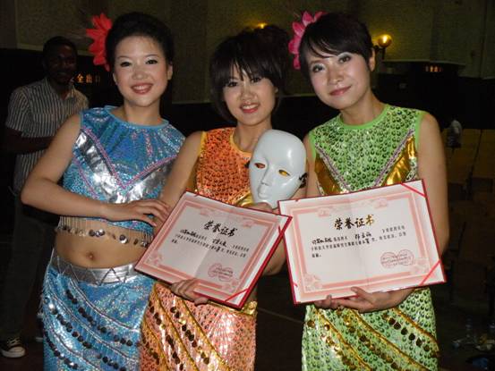 上图是为大家献上优美动人的傣族舞----邵多丽的三位美女在获奖后的合影,三位准专业级的舞林高手甚至对发型的设计,服装道具的选择都一丝不苟,为此跑遍了三处服装道具商店,而三位准专业级的舞林高手为观众献上的准专业级的精彩表演更是获得了全场观众的阵阵掌声。