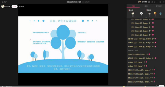 本科2017级辅导员张志为、研究生兼职辅导员黄彩红、辅导员助理王星予利用学校开发的“学在西电”线上教学app,直播了“晚点名”主题班会。因为首次尝试,尽管经过了数天的精心准备和测试,开始前他们还是非常忐忑。从晚8点开始,他们所负责的2017级计算机科学技术专业和物联网专业的500余名本科生分三拨召开了线上班会。看到直播顺畅,同学们基本都到齐了,在平台上跟导员老师活跃地互动,还有部分家长以访客身份观看直播,他们才放下心来,直呼“心血没有白费”。