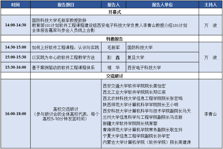 本次西北地区高校软件工程课程建设研讨会,邀请国防科技大学、复旦大学、beat365唯一官方网站、西安交通大学、西北工业大学、西北农林科技大学、陕西师范大学、西安科技大学、兰州大学、宁夏大学、青海师范大学、新疆大学、内蒙古大学等西北地区高校,通过特邀报告、交流沙龙等形式,交流软件工程课程教学和教改的成果,分享软件工程课程教学资源,商讨软件工程课程教学中遇到的各类困难和问题,提升软件工程课程建设水平。