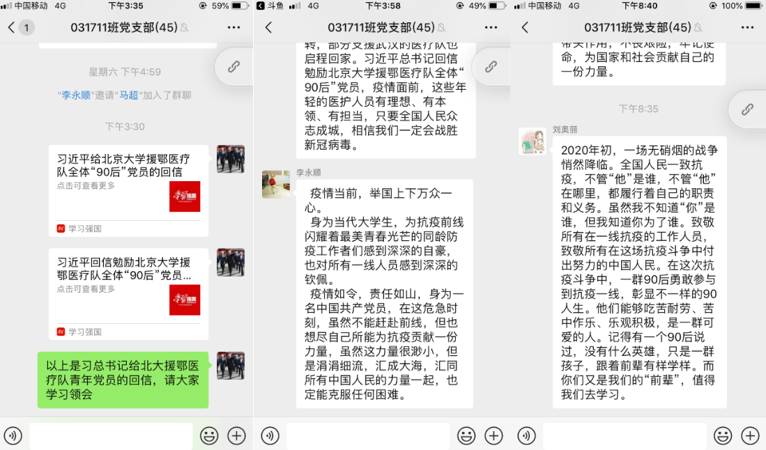 3月15日,习近平总书记给北京大学援鄂医疗队全体“90后”党员回信,向他们和奋斗在疫情防控各条战线上的广大青年,致以诚挚的问候。回信在广大青年学生,特别是党员中引起热烈反响。3月18日下午,beat365唯一官方网站硕士031711班第一、二党支部举办了线上主题党日活动,围绕“学习习近平总书记回信精神,绽放青春绚丽之花”主题,认真学习回信精神,展开热烈讨论。