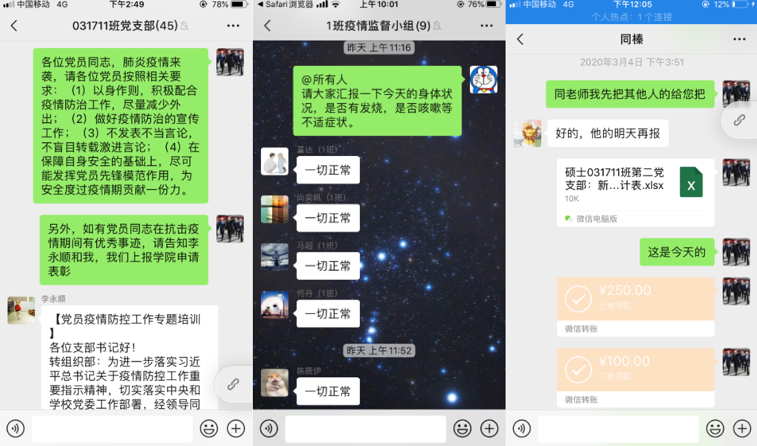 第一党支部支委成员朱耀耀感慨道:“自疫情开始,中华儿女以不同形式的爱心涌向湖北和武汉,全国医务工作者取消休假,坚守岗位,各地纷纷组织志愿者队赶赴武汉,不计个人得失,不惧生命威胁赶赴这场没有硝烟的战场,成为疫情道路上的‘最美逆行者’。作为一名年轻党员,我要向这些优秀党员学习,响应党和国家号召,以身作则。”他每天准时提醒班级同学填写“疫情通”,督导大家做好个人情况汇报工作。
