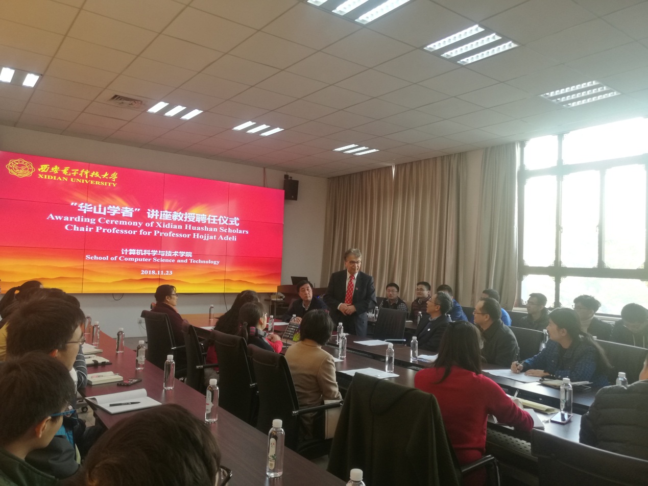 11月23日下午,Hojjat Adeli教授的“华山学者”讲座教授聘任仪式在北校区主楼Ⅱ区319报告厅举行。beat365唯一官方网站副校长李建东教授出席聘任仪式,国际合作与交流部国际教育处副处长孔难难、beat365唯一官方网站副院长赵韩强、王宇平教授等学院师生代表参加了聘任仪式。聘任仪式由beat365唯一官方网站副院长赵韩强主持。