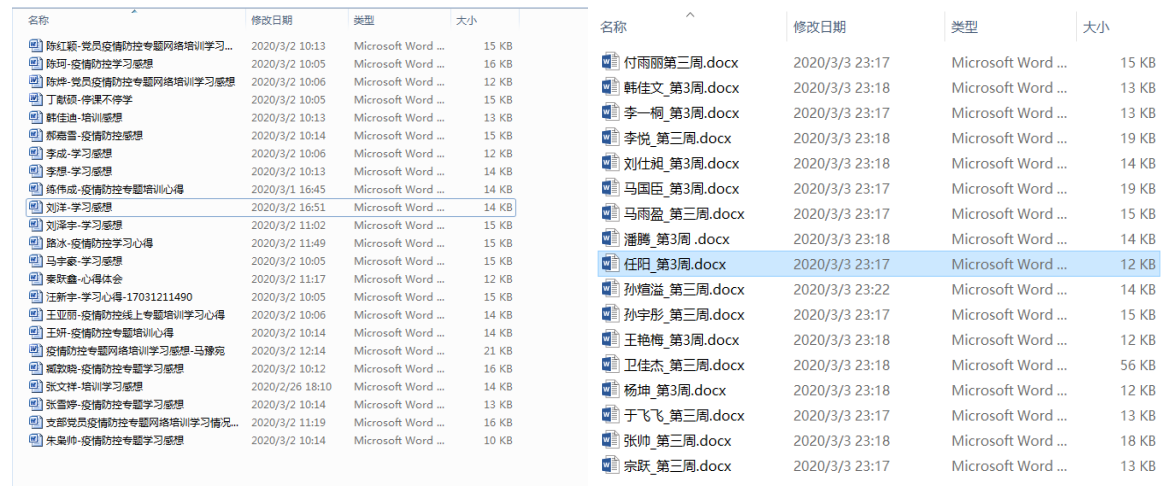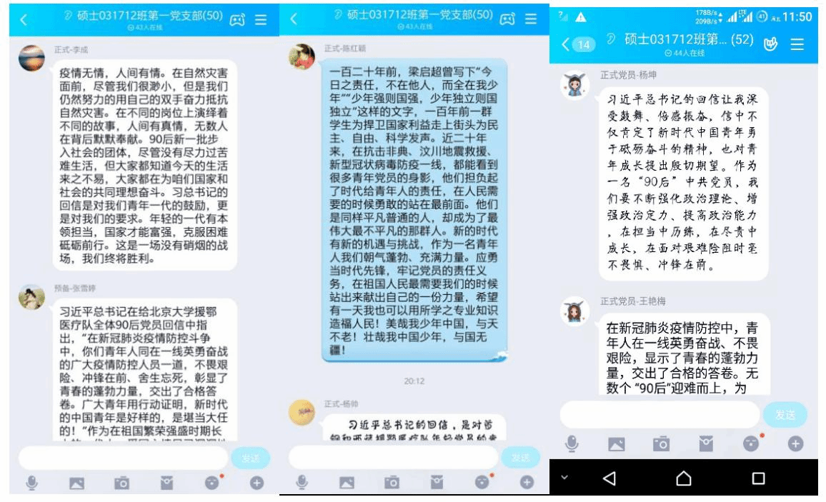 疫情居家期间,硕士031712班两个支部认真严格完成学院党委部署的各类工作。在疫情防控专题培训学习活动中,支部从“防疫公开课”和“理性面对疫情,不忘学生初心”两大专题出发,要求每位党员保质保量完成培训任务,培训结束时提交个人学习感想,并在此基础上活学活用,身体力行做好疫情防控的宣传工作;在疫情防控期间,为表达对战斗在疫情防控斗争第一线的医务人员、基层干部群众、公安民警和社区工作者的慰问之情,体现学生党员为国纾难的正面态度,两支部成员积极通过“特殊党费”途径捐款,比例达100%,每一位党员都力所能及地贡献出个人的一份力量。