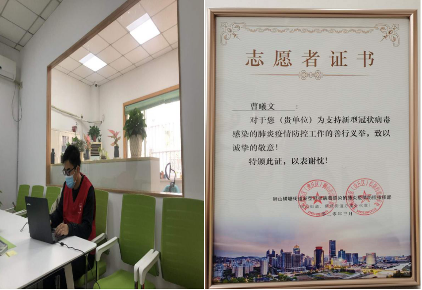 曹曦文同学说道:“得知疫情的严重性后,我也没有多想,只是觉得对小区环境熟悉了解,在社区工作站工作,可以帮助到更多的人。相比那些奔赴前线的优秀青年志愿者们,我做得很微不足道。而作为一名大学生,一名党员,应该像那些志愿者们学习,在祖国最需要的时刻,为抗疫工作贡献上自己的力量,利用自己专业所学对社区数据进行统计、整理和分析,做一些实实在在的事情。工作期间是充实的,也收获了满满的感动,当得到社区居民真诚的感谢时,我内心那种帮助他人解决困难的喜悦是难以言表的,感觉自己是真切的被大家所需要,真正的实现了自己的人生价值。”