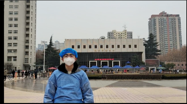 在大礼堂集合后,孙东海同志和一批志愿者穿上防护服和隔离服,开始了协助核酸检测的志愿者工作。孙东海表示,作为一名党员,报名后发现与他有同样想法的同学非常多,父母也鼓励他党员应该冲到最前面。他说到:“我对抗疫怀有积极的看法,大家都众志成城,我们终将战胜疫情”。