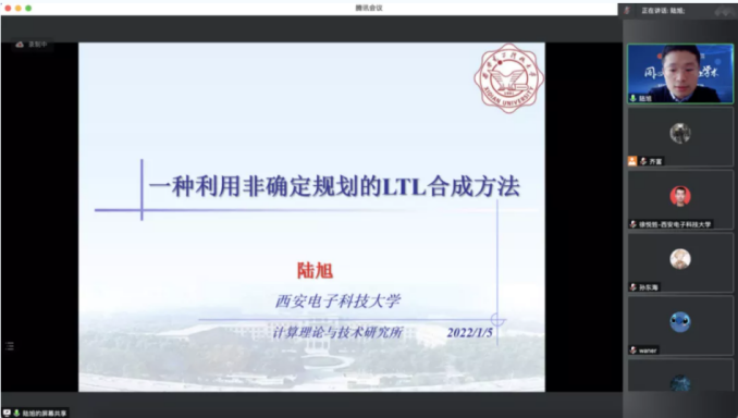 党支部书记陆旭同志积极响应学院组织的“同心战疫,云上学术”系列活动,分享了自身学术研究进展和科研体会。陆旭以“一种利用非确定规划的LTL合成方法”为报告题目,详细地介绍了程序合成的相关背景,以及如何将LTL合成这种程序合成的子类问题转换为智能规划问题。学院近百名研究生与老师聆听了报告,促进了学术交流,提升了学生参与科研的兴趣。