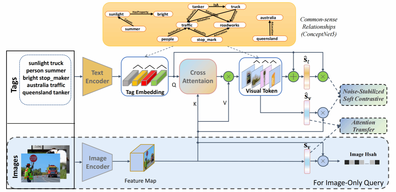 论文提出了一种基于跨模态引导的视觉表示学习框架(CGVR),用于社会图像检索。该框架针对社会图像中用户标签噪声问题,通过引入跨模态交互和先验常识关系,从噪声标签中提取准确的语义信息,并将其迁移到图像哈希子网络中,实现了高效的单模态图像检索。实验结果表明,该方法不仅在多个公开的社会图像基准数据集上取得了显著的性能提升,还能学习到用户标签中的细粒度语义,提升了检索的精准性。
