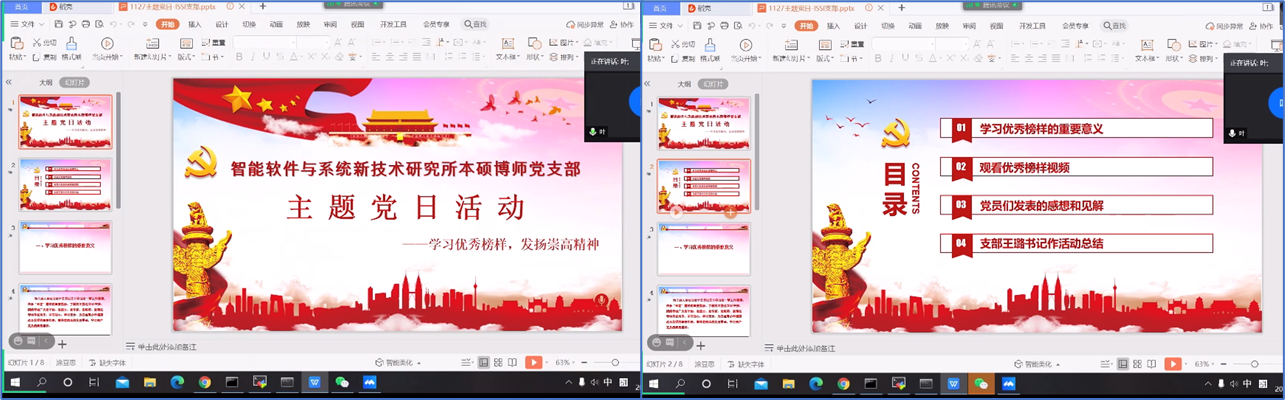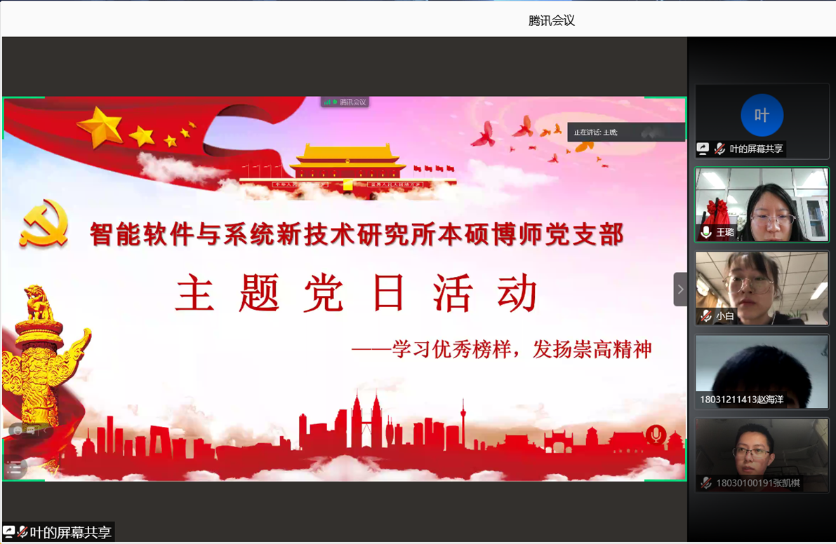 (通讯员 张凯琪)为了深入贯彻习近平总书记关于学习老一辈工作楷模、传承“五老”精神的重要指示,学习和发扬老一辈优秀榜样的崇高精神,beat365唯一官方网站智能软件与系统新技术研究所本硕博师联合党支部于2020年11月27日下午开展了“学习优秀榜样,发扬崇高精神”主题党日活动。活动由支部青年委员叶国强同志主持,共计47人参加,采用腾讯会议线上召开的方式进行。