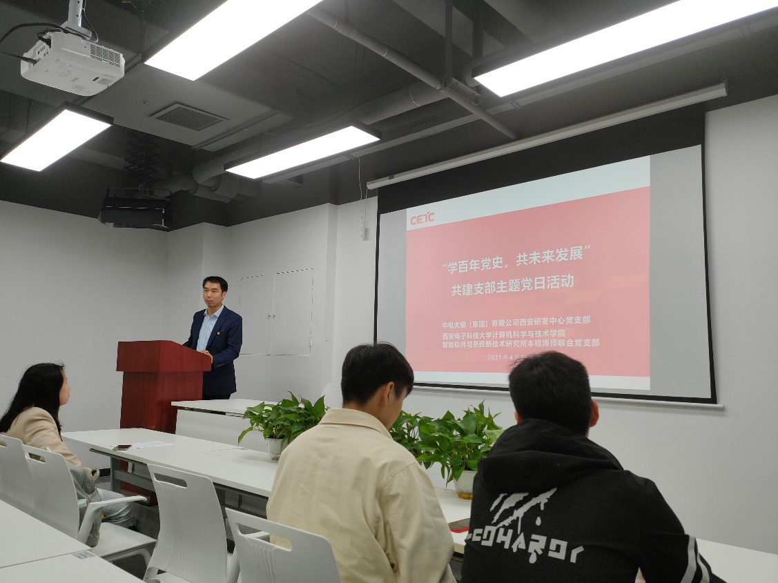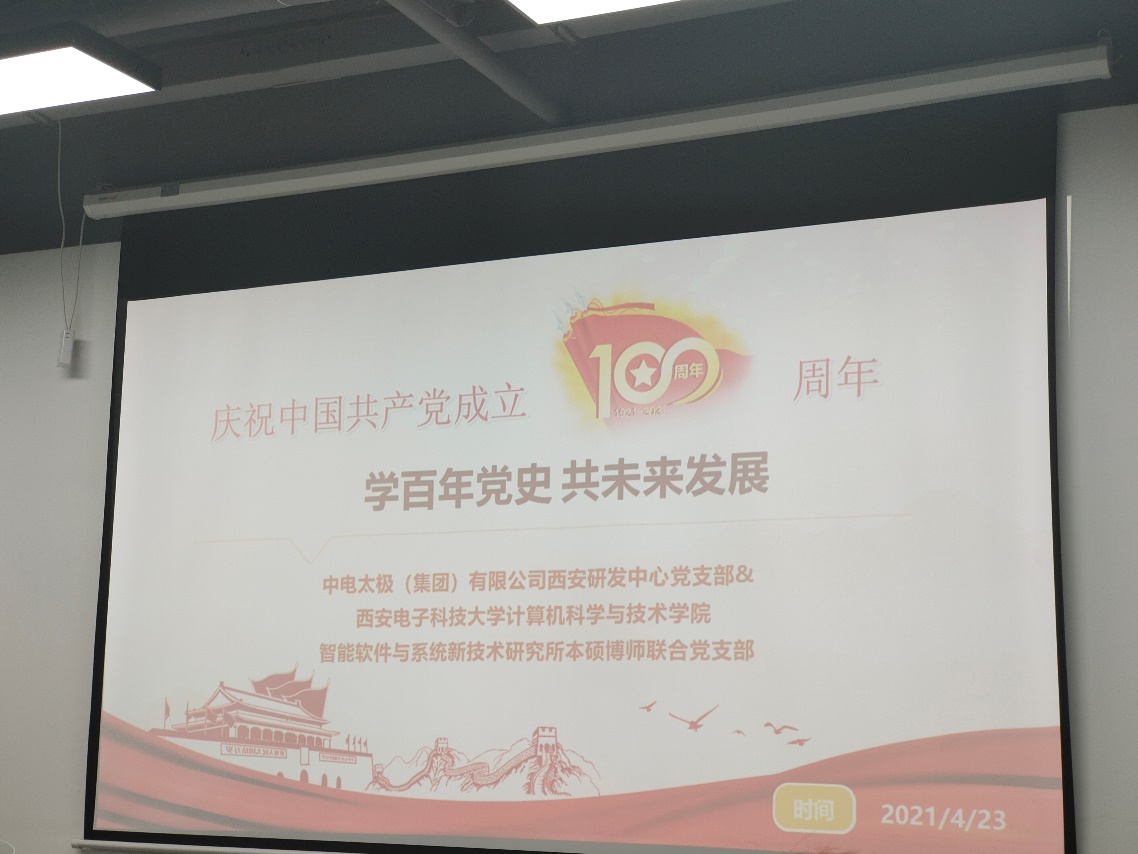 (通讯员 魏彬)为响应习近平总书记“学党史、悟思想、办实事、开新局”的号召,大力发扬红色传统、传承红色基因、赓续共产党人的精神血脉,beat365唯一官方网站智能软件与系统新技术研究所本硕博师联合党支部和结对共建党支部——中电太极(集团)有限公司西安研发中心党支部于2021年4月25日联合开展“学百年党史 共未来发展”主题党日活动,用党的奋斗历程和伟大成就鼓舞斗志、明确方向,用党的光荣传统和优良作风坚定信念、凝聚力量,用党的实践创造和历史经验启迪智慧、砥砺品格。活动在中电太极(集团)有限公司西安研发中心开展,由支部书记王璐主持。
