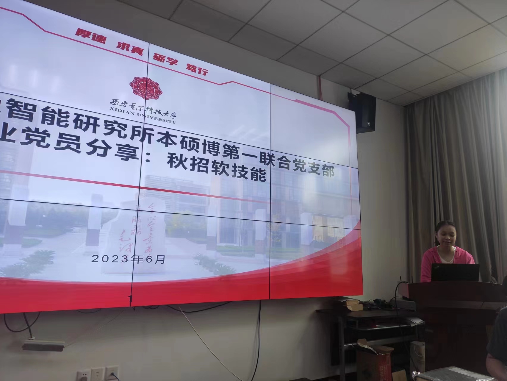 硕士毕业生党员李睿分享了她在秋季求职招聘方面的经验。李睿详细介绍了自己的求职时间线,她从明确求职目标到秋招前期准备,再到求职经验和面试技巧等方面与参会成员进行了深入交流。特别是简历制作和求职期间心态调整的经验,不仅为大家提供了实用的求职指南,也激发了大家对秋季求职的信心和动力。