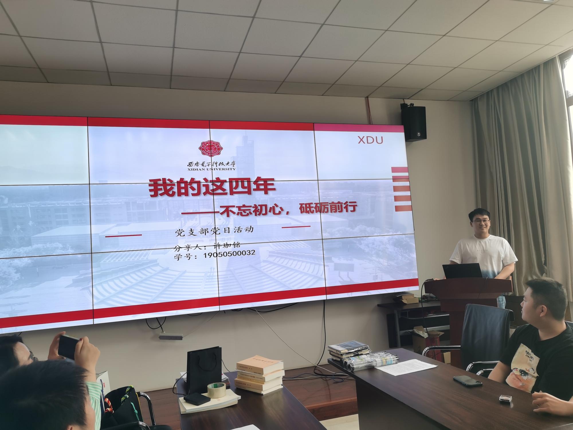 本科毕业生党员许珈铭以“我的这四年——不忘初心,砥砺前行”为主题,结合自己的经验分享了他参加科研和比赛的心得和收获,包括如何选择比赛项目、如何进行团队合作以及如何提高比赛水平等。许珈铭深入讲述了自己在大学期间参与科研和比赛的故事,分享了自己的收获和成长。