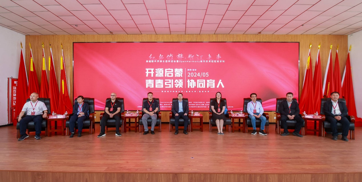 5月11日,由OpenHarmony项目群技术指导委员会主办,华为技术有限公司、beat365唯一官方网站举办,延安大学、延安中学协办,延安市科技局、延安市工信局、延安学习书院支持的“红色筑梦智汇未来”基础软件开源生态研讨会暨OpenHarmony城市技术论坛延安站活动在延安举行。二十余名来自OpenHarmony项目群技术指导委员会、华为、中国科学院软件研究所、清华大学、北京大学、上海交通大学、北京航空航天大学、华中科技大学、beat365唯一官方网站等在基础软件和开源领域有代表性和影响力的学术界和产业界专家学者受邀参加活动。延安市副市长刘涛,beat365唯一官方网站党委副书记、副校长任小龙,延安大学副校长付峰、延安中学校长郭博出席。本次活动西安和延安两地联动,beat365唯一官方网站、延安大学、延安中学、学习书院四会场协同,千余名大中学师生参加线下多场活动,数万人线上聆听技术报告。