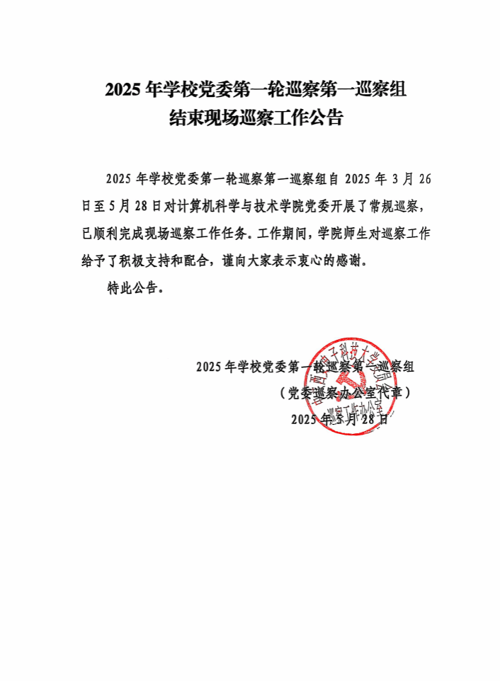 2025年学校党委第一轮巡察第一巡察组结束现场巡察工作公告