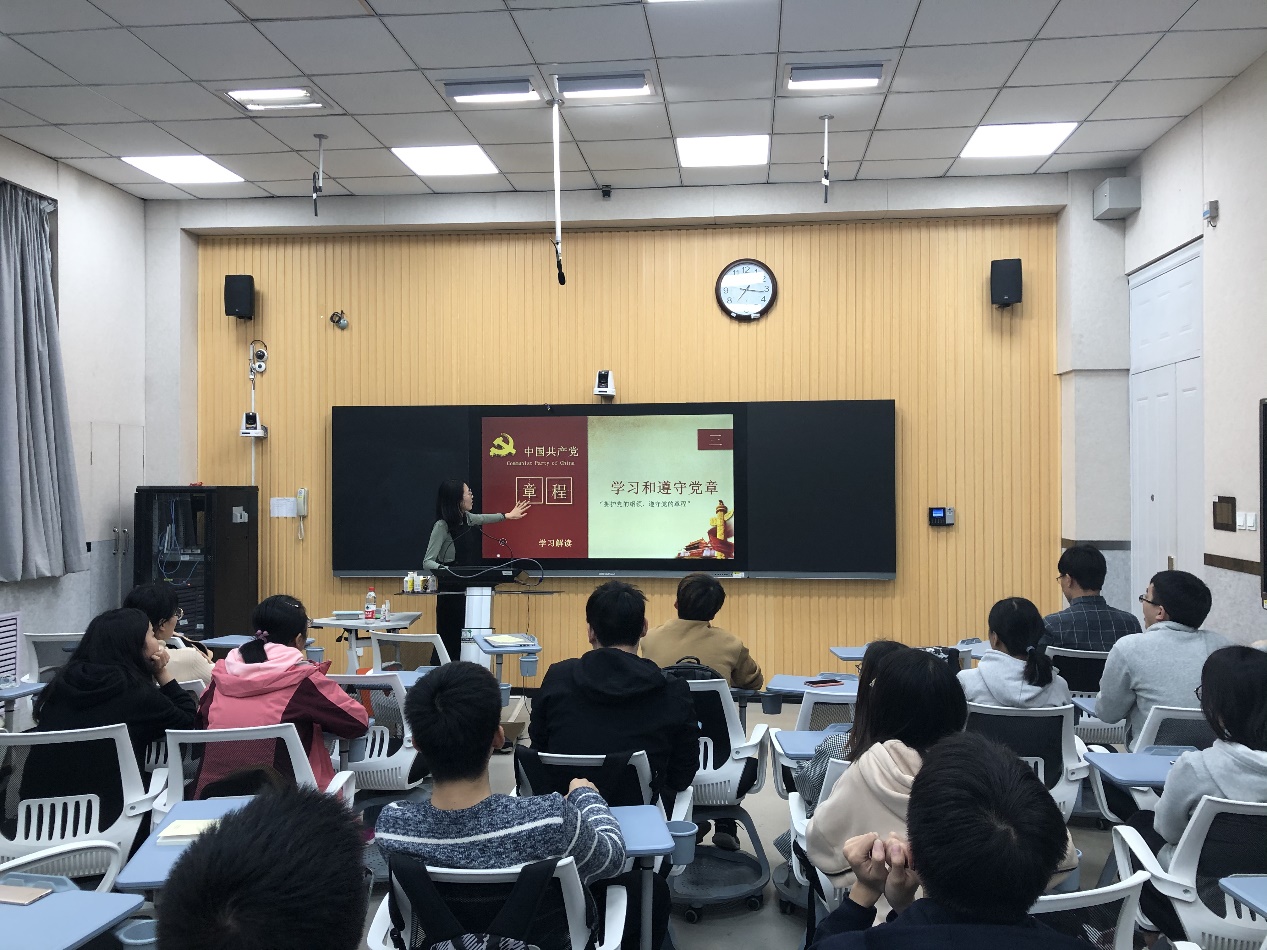 首先,纪律委员房慧娟同志从“党章是什么、党章讲什么、党章要求做什么”三个方面为支部全体党员进行了讲解,重点解读了十九大新党章的总纲部分及党的纪律和纪律处分。党章是党发展过程中经验教训的总结,是把握正确政治方向的根本准则,是党员加强党性修养的根本标准,是坚持从严治党方针的根本依据。全体支部党员认真学习新党章,将党章“内化于心,外化为行”,在实践中把各项要求真正落到实处,做习近平新时代中国特色社会主义思想的践行者。