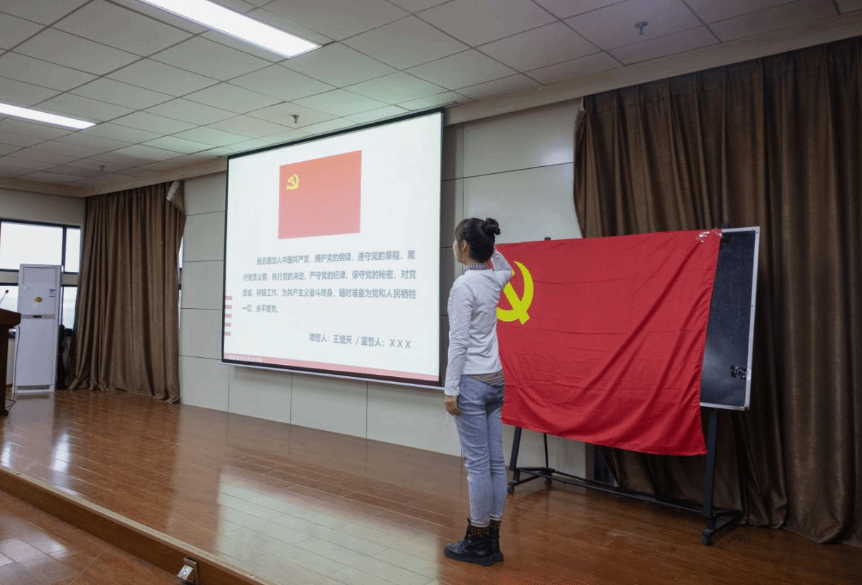 69名预备党员面向鲜红的党旗,举起右手向党旗庄严宣誓。在今后将进一步坚定理想信念,提高党性修养和政治觉悟,牢记我校“全心全意为人民服务”的办学宗旨,不忘初心、牢记使命,永担新时代青年的时代责任。