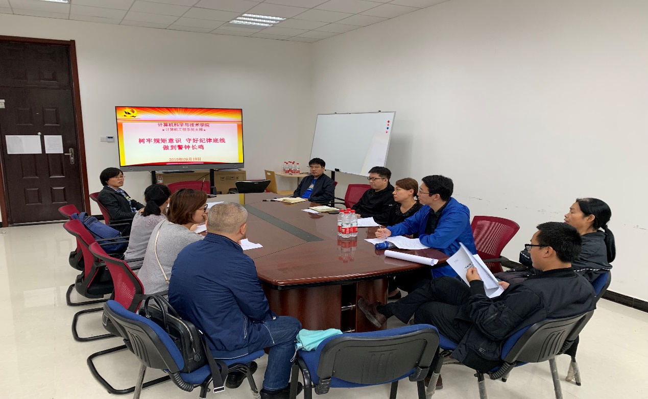 鱼亮首先介绍了计算机工程系党支部组织生活会的准备情况,包括组织全体党员集中学习或自学包括党章党规、《“不忘初心、牢记使命”主题教育最全应知应会知识》、《习近平关于全面从严治党的重要论述摘编》等材料。组织支部全体党员集体学习学校纪委办公室印发的我校“8∙19”案件剖析材料——《“前腐后继”的权欲悲剧》。同时,支委班子分阶段分类型开展了覆盖全体计算机工程系教师的民主调研,收集有效建议与意见,促进计算机工程系支部以及支委工作进一步提升。