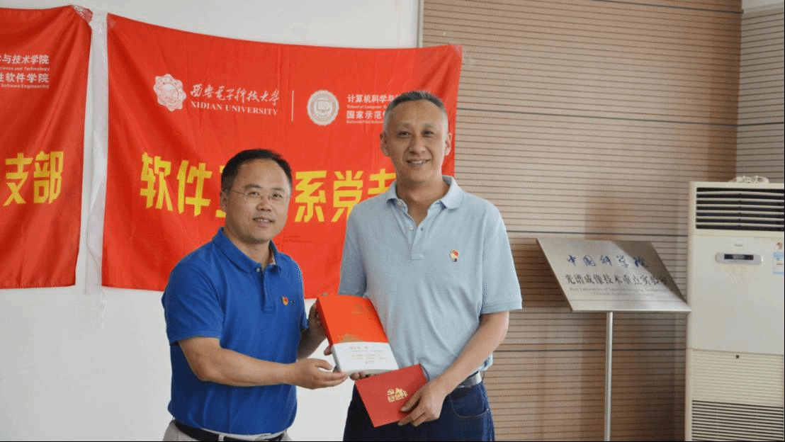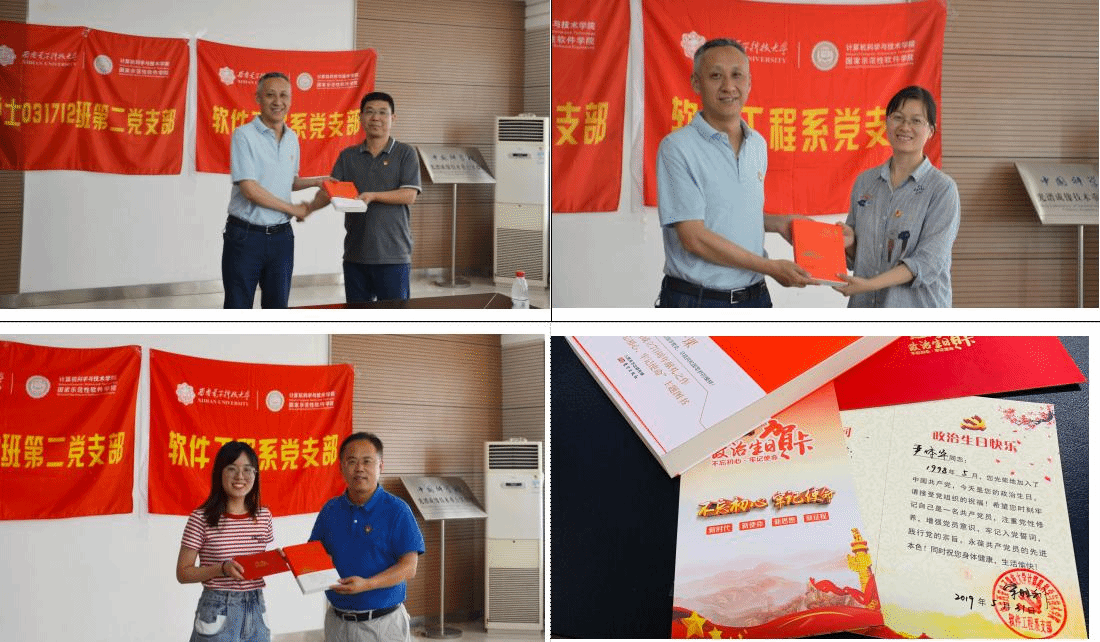参观学习结束后,全体师生党员在光谱成像技术重点实验室会议室为五月份入党的师生党员过了隆重而又简朴的政治生日。支部书记宋胜利宣读了五名师生党员名单和入党日期,校长助理王泉、计科院党委书记李青山分别为党员送上了软件工程系党支部精心订制的政治生日贺卡和生日礼物——新中国成立70周年献礼之作:《国史第一课》。五月恰逢王泉助理政治生日,李青山代表党支部全体党员为他送上了政治生日贺卡和生日礼物。