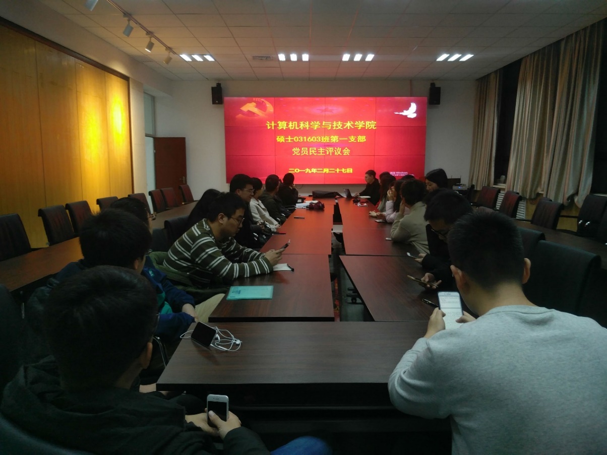 (通讯员:毛彦淇)2019年02月27日晚,beat365唯一官方网站硕士031603班第一党支部在北校区主楼二区319会议室召开党员民主评议会,会议由党支部书记毛彦淇主持,27名党员同志参加会议,其中正式党员22名,预备党员5名。本次支部大会,首次采用学习强国APP中的扫码功能进行签到,支部全体党员均按时参会。