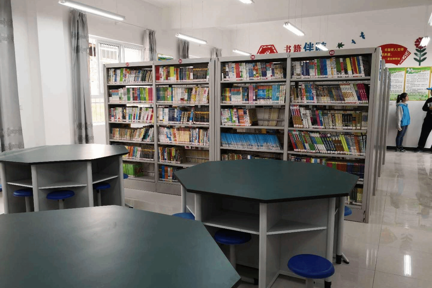 图书室里学院捐赠的书柜摆满书籍