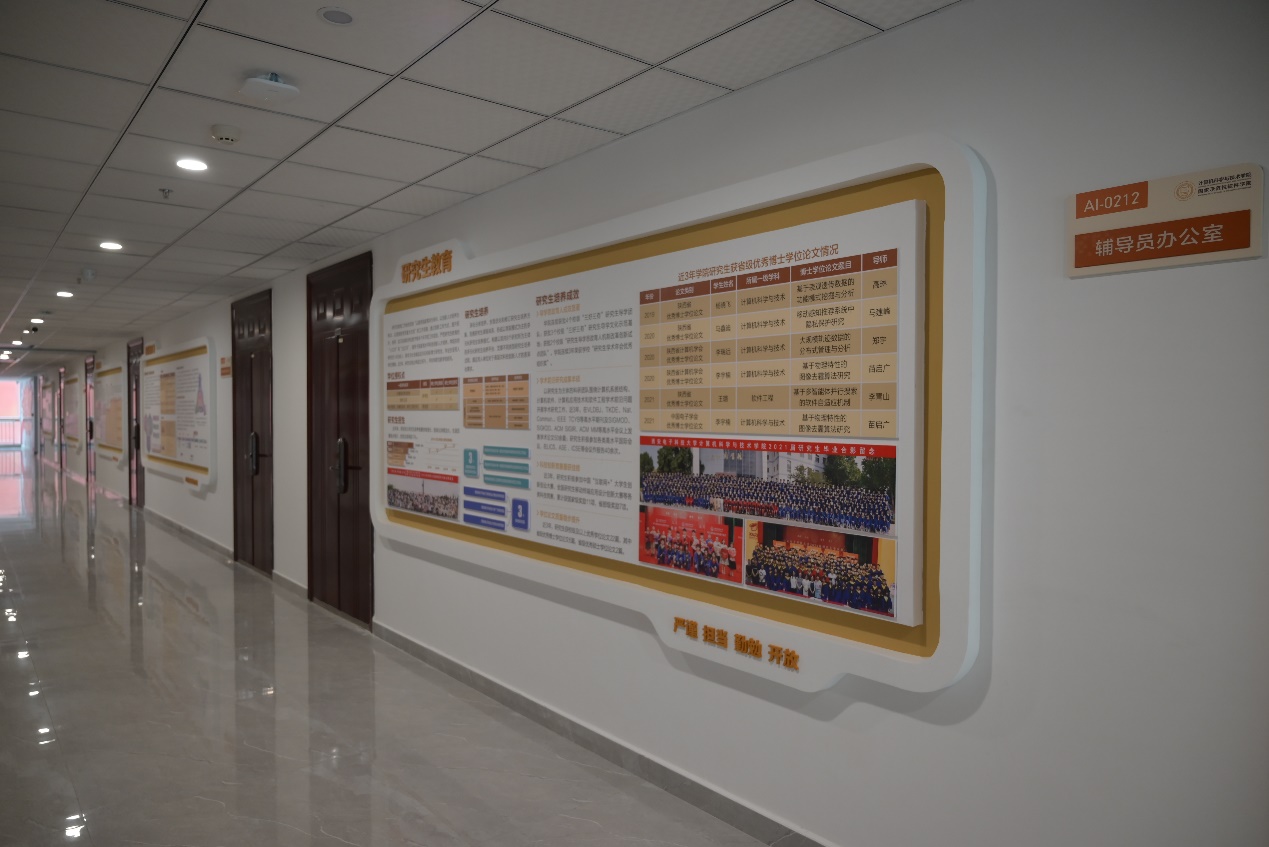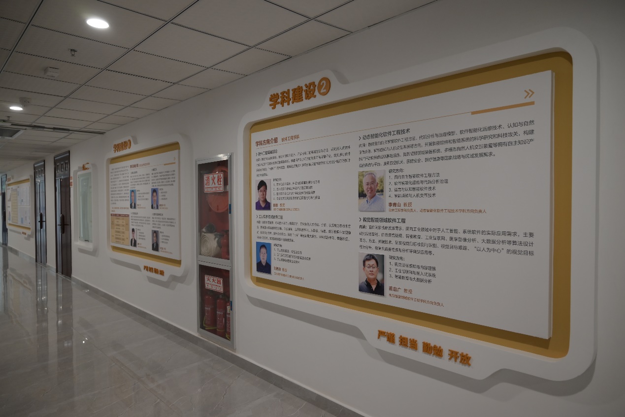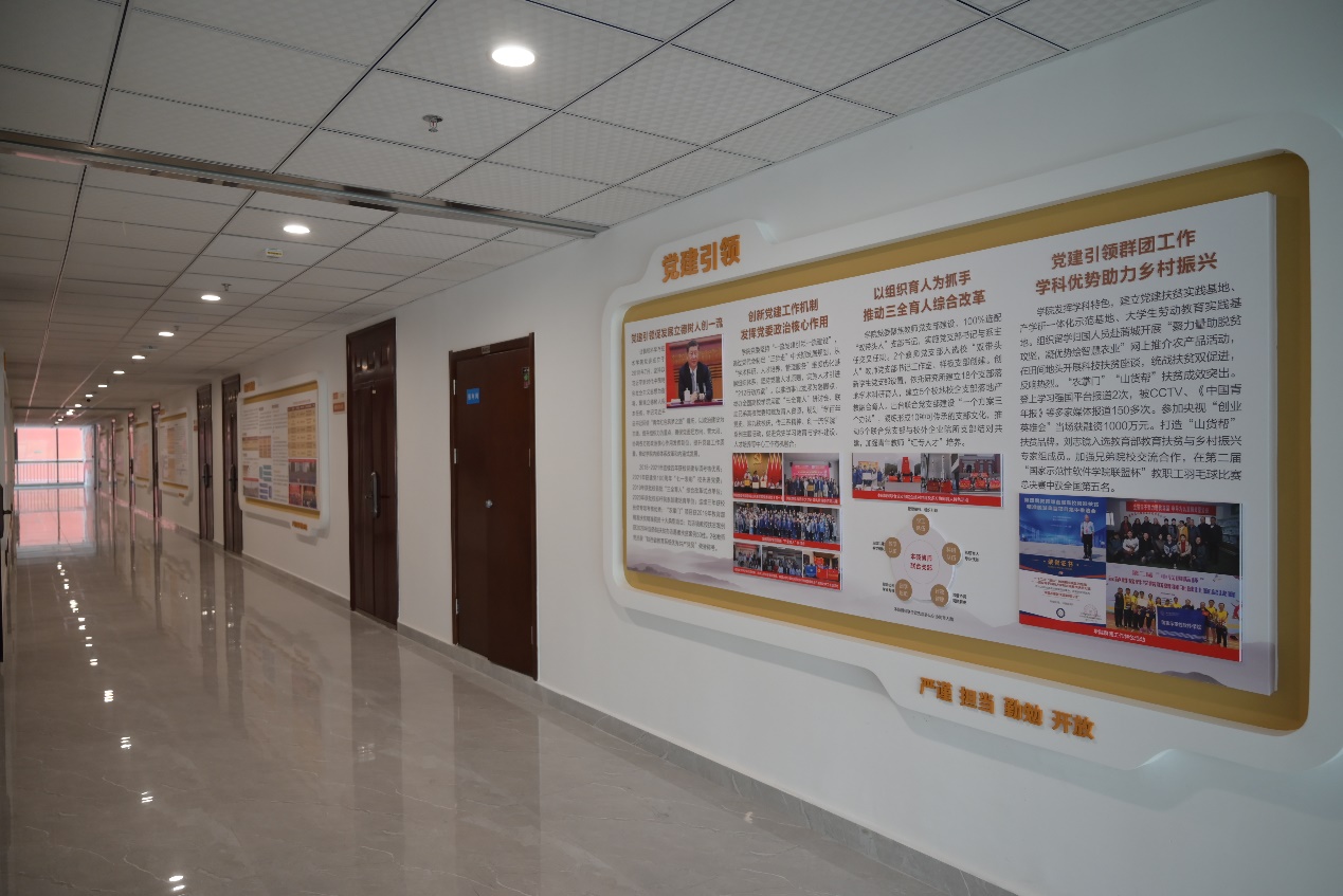 班子成员从网安大楼2楼学院的办公区域开始查验,仔细对形象墙、文化墙、教师墙和毕业生照片墙等各墙面的文化建设情况进行了检查,对整体设计情况表示肯定,同时也向文化建设项目的建设方提出了要求:尽快修正细节问题,为即将入驻的师生呈现最佳的文化环境和氛围,将学院的文化建设打造成精品工程。