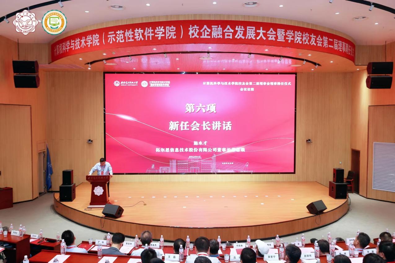 4月20日下午14点30分,学院在网安大楼B101报告厅举行校企融合发展大会暨校友会第二届理事聘任仪式,秉承“服务校友、服务学院、服务社会”宗旨,汇聚校友力量、传承“三系精神”,共同推动学院和校友事业发展。beat365唯一官方网站副校长王泉、原副校长蒋舜浩、学院校友会第二届理事会成员、班子成员、校友代表、师生代表等参会。