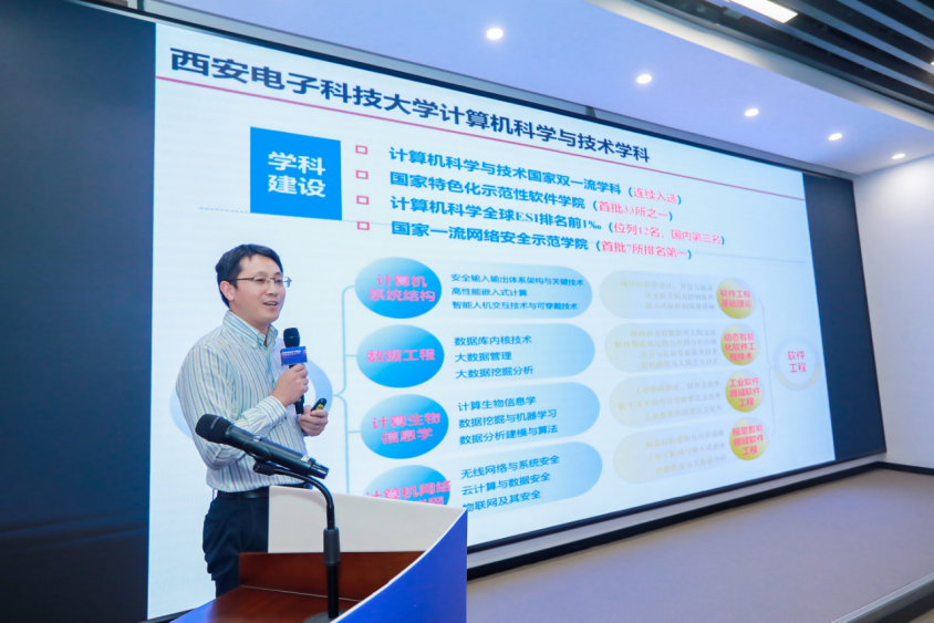 随后,沈玉龙教授与参会企业共同分享了《计算机技术前沿发展趋势》主题报告,并进行了开放应用场景的“揭榜挂帅”,从计算机科学与技术和软件工程两大学科,详细讲解了西电beat365唯一官方网站科学研究内容和技术应用场景。