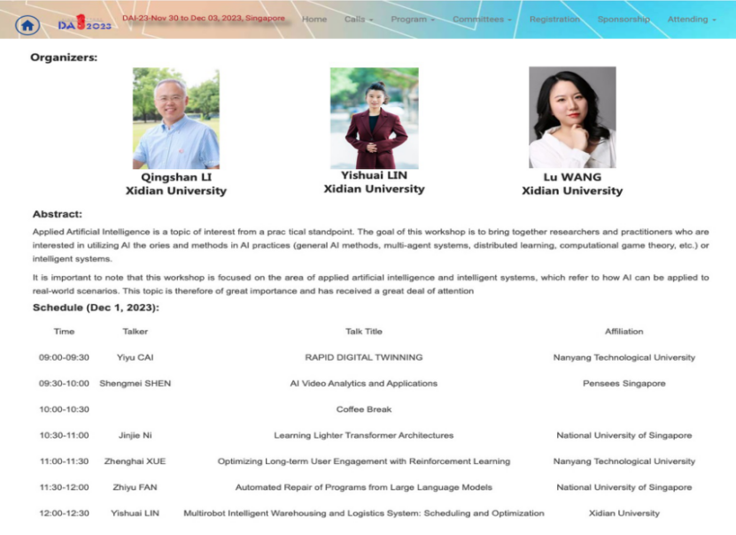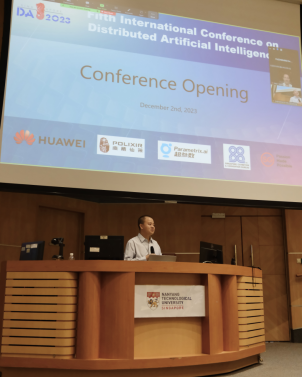 (通讯员 徐悦甡)2023年11月30日至2023年12月3日人工智能领域知名国际会议DAI 2023(Distributed Artificial Intelligence Conference,国际分布式人工智能会议)在新加坡成功举办,会议围绕通用人工智能、多智能体系统、软件工程与人工智能、计算博弈论等主题展开研讨。作为一届人工智能领域高水平的国际盛会,大会邀请了Milind Tambe(哈佛大学Gordon McKay计算机科学教授、谷歌研究院AIfor Social Good主任、AAAI/ACM Fellow),Yuhuai (Tony) Wu(xAI联合创始人),Carla P. Gomes(康奈尔大学Ronald C.and Antonia V.Nielsen计算和信息科学教授、计算可持续性研究所主任, AAAI/ACM Fellow),Joseph Sung(南洋理工大学高级副校长、中国工程院院士,前香港中文大学校长)做特邀报告,并组织了6大主题的顶会级别的会议报告和多个聚焦前沿性研究的学术沙龙。大会由南洋理工大学安波教授、德克萨斯大学奥斯汀分校Peter Stone教授共同担任大会主席。